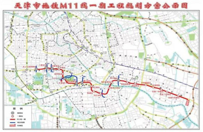 天津地鐵11號線一期工程線路全長22.6公里,共設21座車站,均為地下站。在東麗區(qū)設置七經(jīng)路定修段一座。本工程設有兩座主變電所,新建六里臺主所1座與7號線共享,新建馴海路主所1座,與Z1線共享,正線設置牽引變電所11座,定修段獨立設置 1座牽引變電所。控制中心一處,設置在華苑車輛段內(nèi),另外在七經(jīng)路定修段設備用控制中心一處。概算總投資256.02億元。