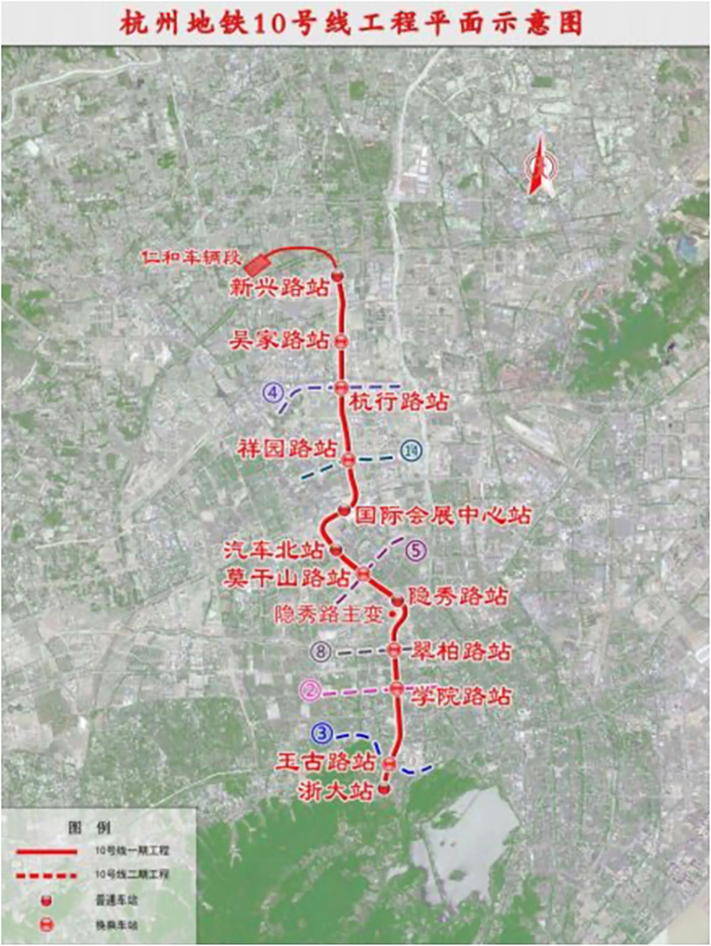 項目建設規模規模10號線一期工程起于浙大站,沿浙大路→玉古路→學院路→余杭塘河邊→莫干山路→石祥路→杭行路→勾仁大道敷設,終止于新興路站,線路全長15.92公里,設置站點12座,全部為地下線,平均站間距1407.21米。10號線一期工程可與地鐵2、3、4、5、14等5條線路形成換乘。